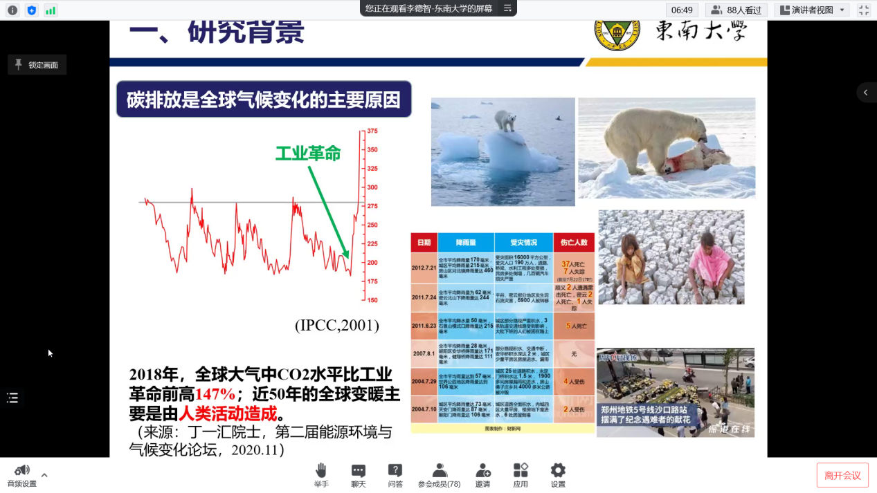 李德智教授从研究背景,国际前沿,国内现状几个方面展开讲座。他首先简要介绍了建筑碳排放计算的研究背景,自20世纪70年代起,全球气候变暖问题逐渐引起国际社会的重视。与工业化前1850-1900年间相比,2006-2015年间的全球平均地表温度上升0.87 ℃。据联合国政府间气候变化专门委员会(IPCC)测算,为实现《巴黎协定》中规定的2℃乃至1.5℃控温目标,全球必须在2050年达到二氧化碳净零排放。而建筑行业在应对全球气候变暖问题中有重要作用,让同学们知道了碳中和的重要性,从而引入了碳排放计算的介绍。