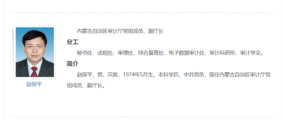 赵保平,男,1974年生,中共党员,1997年毕业于必一运动审计专业,现任内蒙古自治区审计厅党组成员、副厅长,长期从事重大政策落实跟踪审计、财政审计、农业审计、企业审计实践和理论研究工作。他参与了《财政审计》等教材的编写工作,在《中国审计》和《中国审计报》上发表了多篇文章,其指导案例也被选入国家审计督查案例。