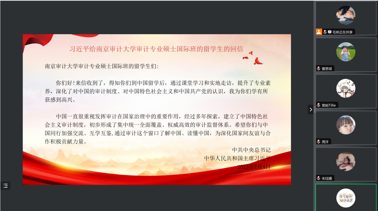 支部党员朱钰婕表示:“在看到习近平总书记的回信后,我感到作为新时代审计人,我要扎实学习专业知识,不断钻研创新,讲好中国审计故事,未来担当起审计发展与国际传播使命。”