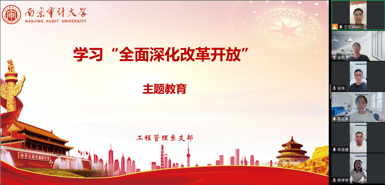 为进一步贯彻落实习近平新时代中国特色社会主义思想主题教育,6月14日上午,工程管理系支部在线上开展“全面深化改革”专题学习。工程管理系支部全体教工党员参加会议,会议由支部书记王庄主持。