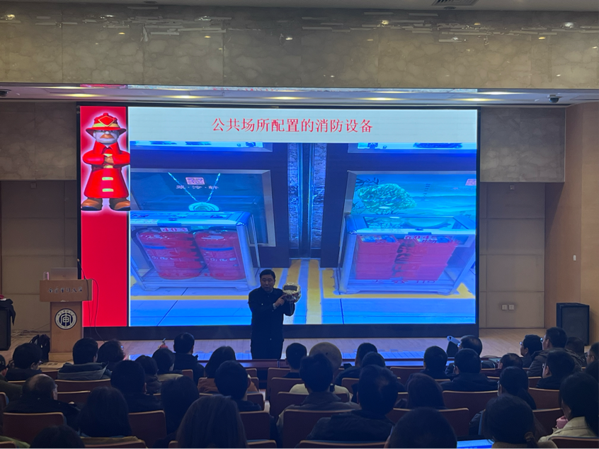 金涛教员通过生动的案例分析,深入浅出地向师生们传授了火灾的成因、危害及预防措施。他现场演示了灭火器、防烟面具等消防设备的正确使用方法和注意事项,让参会人员更加直观地了解如何应对突发火灾。