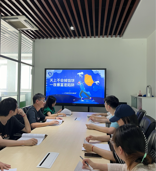文体部部长杨婕结合《防范非法集资宣传教育相关资料》,带领与会人员学习非法集资的定义、行为必备三要件、主要表现形式等。通过深入了解非法集资的常见手法、步骤、套路,提高风险防范意识,并提出严格遵循防范非法集资的方法“四看三思等一夜”,规避非法集资陷阱的“三要、三不要”。与会人员围绕典型案例和防范策略等方面进行了深入探讨,会议现场气氛热烈。全体与会人员会前认真准备非法集资案例资料,踊跃参与、积极辩论、认真倾听,会后认真总结,取得了普法宣讲入万家,防诈防骗入脑入心的良好效果。