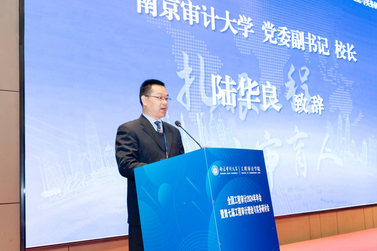 公司党委副书记、董事长陆华良教授致欢迎辞。他首先向出席大会的各位领导专家、同仁朋友表示热烈的欢迎和诚挚的感谢。他表示,在这个充满挑战与机遇的新时代,工程审计的使命更加光荣,责任更加重大。我们要以更高远的战略眼光、更开阔的国际视野,深入思考如何让工程审计在服务国家治理体系和治理能力现代化建设中发挥更大作用。特别是要深化对“数据赋能、科技赋智”的认识,推动工程审计从“单一监督”向“智慧治理”转变,从“事后把关”向“全程共治”升级,真正成为推动中国式现代化建设的重要力量。他提出,一要以战略思维把握工程审计新定位;二要以创新思维开创工程审计新境界;三要以辩证思维构建工程审计新格局;四要以前瞻思维谋划工程审计新未来。他希望,与会专家学者和实务工作者以此次大会为契机,深入交流、凝聚共识,共同探索中国式现代化背景下的工程审计创新发展之路,也期待通过本次大会,进一步加强高校与审计机关、企事业单位之间的交流合作,为推动我国工程审计事业高质量发展贡献智慧力量。